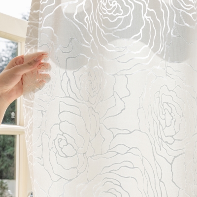 Uno schizzo delicato su tulle trasparente, in cui le rose vengono svelate attraverso una sofisticata tecnica dévoré, creando l'illusione di fiori che emergono con grazia. Il sottile contrasto tra le parti intatte e quelle sbiadite conferisce al velo, realizzato in tulle di alta qualità prodotto in Italia, un carattere arioso, una consistenza unica alla vista e al tatto.Nelle tende più lunghe di 2,7 m, potrebbe essere visibile un segno di cucitura orizzontale dovuto alla lunghezza del tessuto.- Composizione: 65% poliestere, 35% cotone