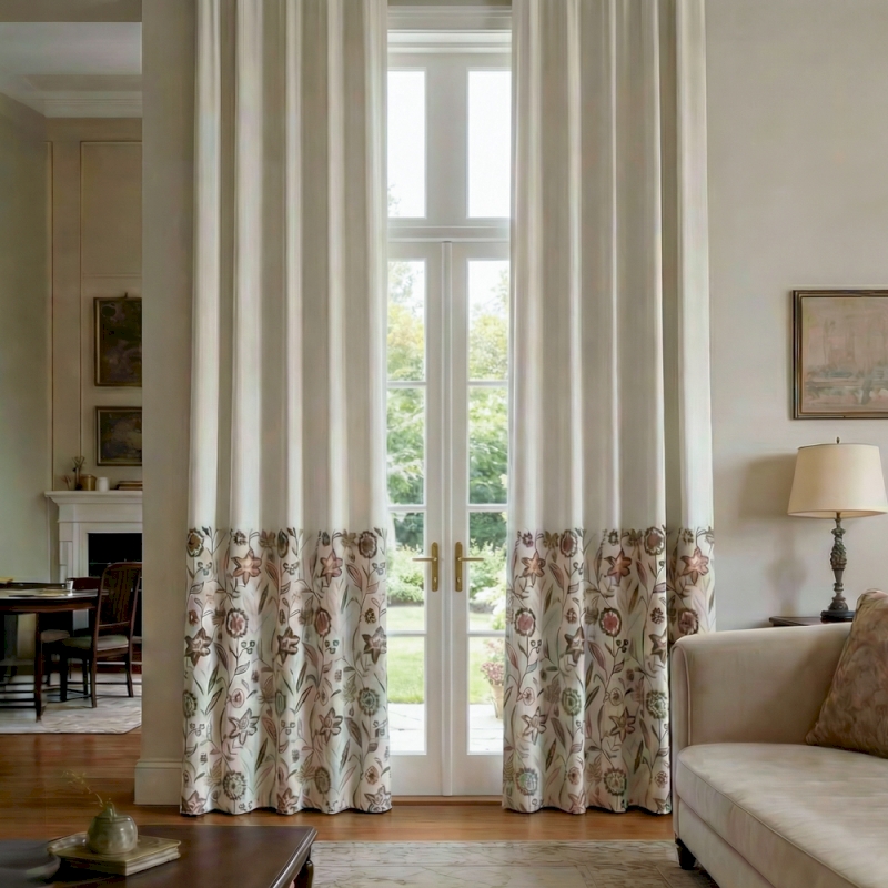 Tenda FLORÉLIA realizzata su misura, in tessuto effetto cotone-lino, con ricamo floreale nella parte inferiore.
