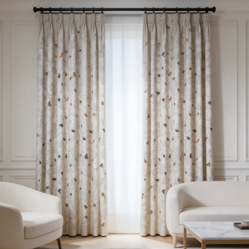 Tende > Tenda su misura ALVÉRIA, tessuto effetto lino ricamato, motivo farfalle e vegetazione