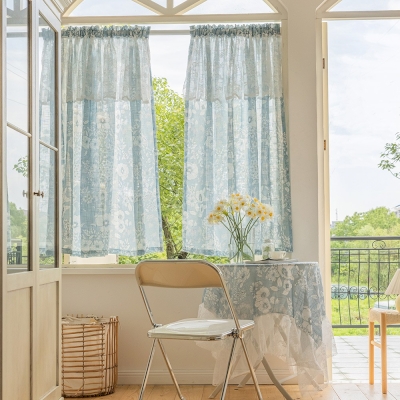 Tenda trasparente stampata, tessuto testurizzato in lino, fiori azzurri