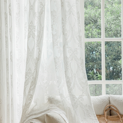 Queste tende eleganti e raffinate incarnano un'estetica delicata con il loro colore bianco immacolato. Il tessuto, simile alla mussola ariosa, gioca con la luce creando un'atmosfera accogliente e calda. Il motivo in rilievo, ispirato allo stile barocco, aggiunge un tocco di classica raffinatezza, garantendo al contempo una consistenza morbida e una sensazione di morbidezza al tatto. Ogni dettaglio del motivo è messo in risalto dalla qualità della trama, offrendo una presenza discreta e al tempo stesso d'effetto nel vostro spazio abitativo.